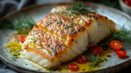 A beautifully cooked cod fillet served with a rich beurre blanc sauce, garnished with herbs, captures the essence of fine dining in a warm atmosphere. Generative AI