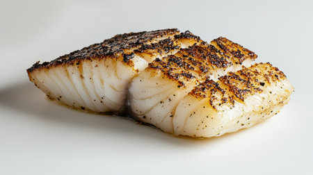 A beautiful grilled white fish fillet showcases enticing grill marks on a light background, emphasizing its flaky texture and savory appeal.