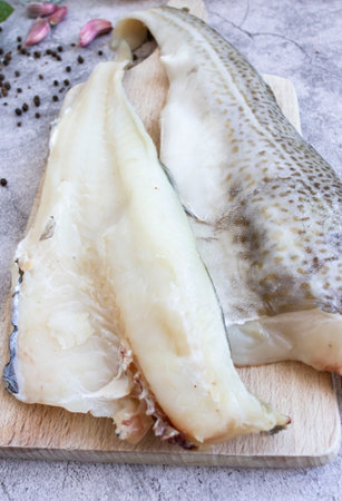 Fresh fish, raw code fillet. Lies on a wooden board in the kitchen