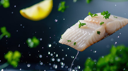 A vibrant fish fillet garnished with herbs and lemon is captured mid-air, creating an artistic splash. Perfect for showcasing culinary artistry and healthy eating inspiration.