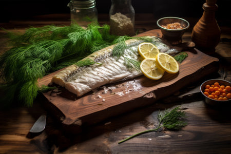 Delightfully Fresh Sturgeon Fish Infused with Dill and Lemon Displayed on a Rustic Oak Table