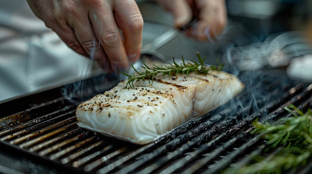 Grilling halibut fish with rosemary on a barbecue grill. Generative Ai.