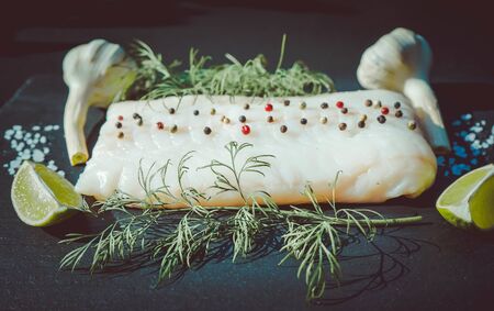 Fresh Raw Cod loin fillet with rosemary, chillies, cracked pepper and lemon on stone board