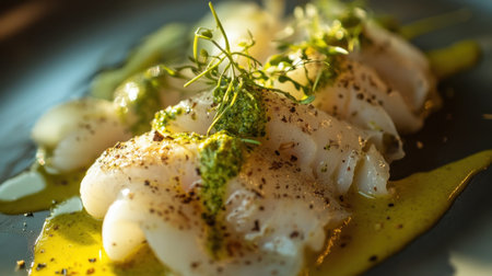 A beautifully presented gourmet white fish dish featuring vibrant colors and delicate garnishes, showcasing culinary artistry for food photography and fine dining enthusiasts.