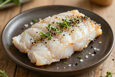 Basil-Infused Fresh Raw Cod Fillet Served on a Stone Plate: A Delectable Delight in Top View