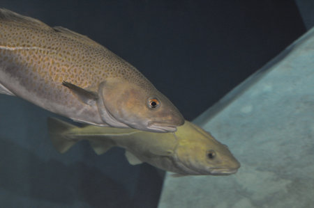 Cod fish in the aquarium. Close-up view of the head.