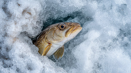 A fish breaks through an icy surface, revealing distinct textures of water and ice in a cold aquatic habitat.