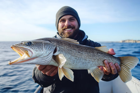 Fisherman hand with Cod fish against background of sea.