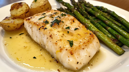 White Fish Fillet, Breaded Pike Perch, Zander Fillet with Cream Sauce Closeup, Restaurant Main Course with Fried Sander Fish or Pike Meat with Lemon and Greens, Generative AI Illustration