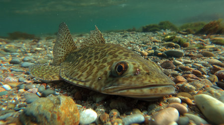 A flatfish lies camouflaged against a pebbled ocean bottom