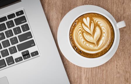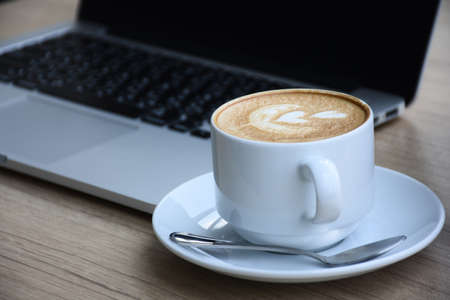 Hot art Latte Coffee in a cup and laptop on wooden table in Coffee shop image