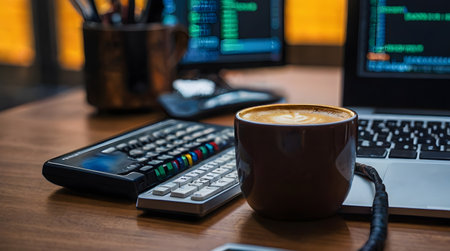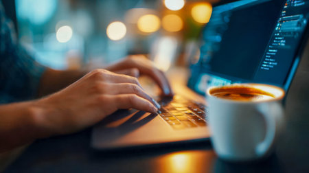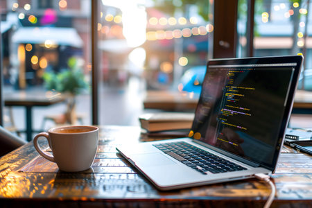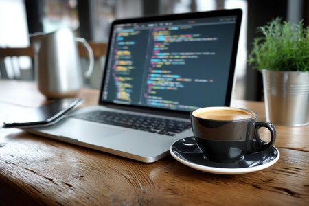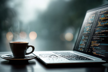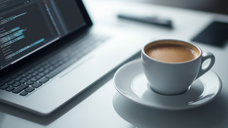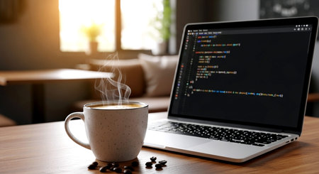 A captivating scene featuring a freshly brewed coffee cup beside a sleek laptop displaying code, embodying a modern workspace ideal for productivity and creativity.