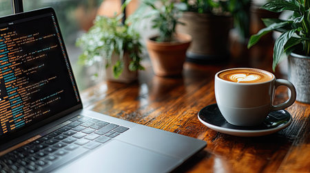 A laptop displaying code sits open beside a cup of coffee on a wooden table. The warm lighting highlights the textures of the wood and the smooth surface of the cup and saucer. Potted green plants add a natural element to the scene. This image could be used for articles on technology, work from home, or lifestyle.