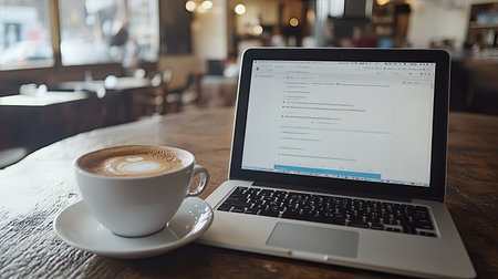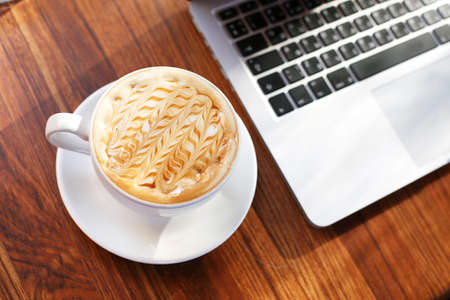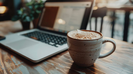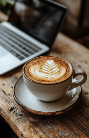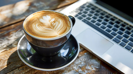 Cappuccino cup next to a laptop on a wooden table in a cozy setting