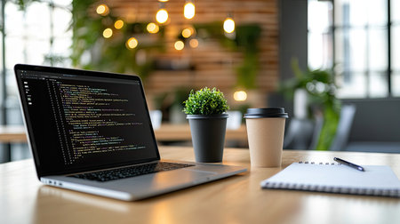 A modern workspace with a laptop displaying lines of code, a coffee cup, and a notepad, symbolizing software development.