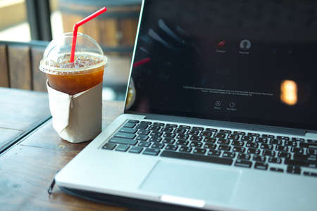 Laptop Notebook with iced coffee cup on wooden table in coffee shop