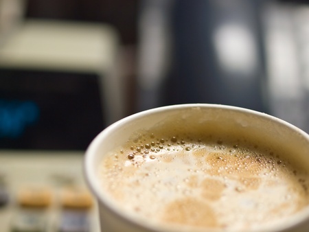 Cup of Coffee in a Paper Cup on a Office Desk