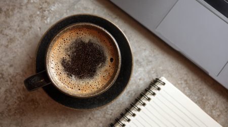 A beautifully arranged coffee cup rests on a stylish table next to a laptop and an open notebook, creating an inviting workspace scene for creativity and productivity.