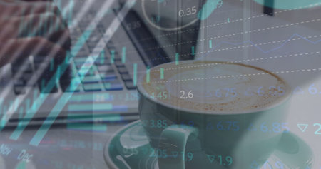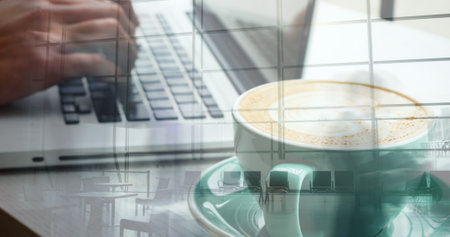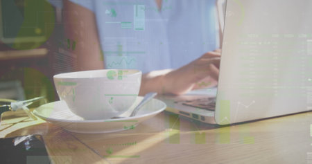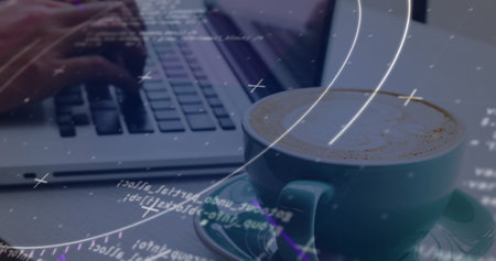 Image of hands of caucasian woman using laptop over cup of coffee. global business, finances, connections and digital interface concept digitally generated image.