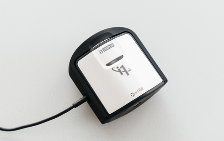 PARIS, FRANCE - JUL 12, 2017: X-Rite i1Display Pro professional calibration device for modern monitor on light gray background. A Tristimulus colorimeter, colloquially shortened to colorimeter, is used in digital imaging, to profile and calibrate output d