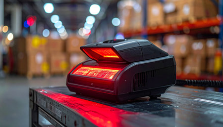 An industrial barcode scanner with a red light beam sits on a surface in a blurred warehouse filled with shelves of boxes.