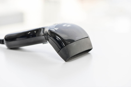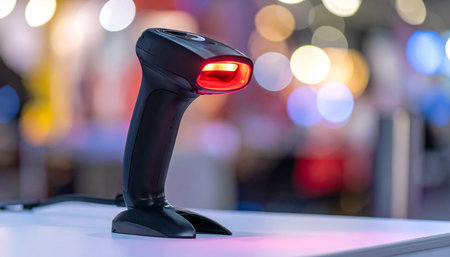 A black handheld barcode scanner with a red laser beam is positioned on a white surface, with a blurred background.