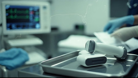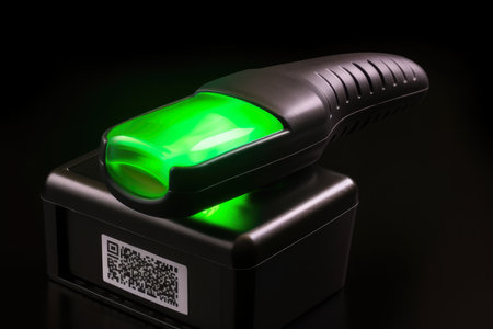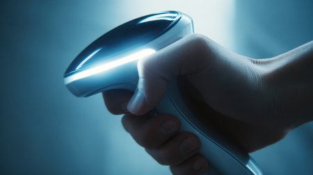 Hand Holding Modern Handheld Scanner Device with Glowing Light in a Dimly Lit Background for Application in Retail and Inventory Management