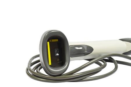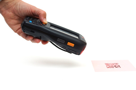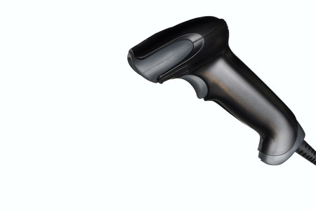 Barcode scanning. Reader laser scanner for warehouse. Retail label barcode scan isolated on white background. Warehouse inventory management