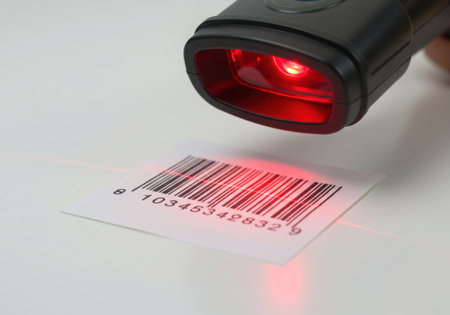 A close-up shot of a barcode scanner emitting a red laser beam while reading a barcode.