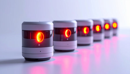 A network of advanced AI-powered sensors stands vigilant, their glowing red eyes scanning in unison. This represents a new era of automated security, surveillance, and data monitoring, where technology is always watching and processing information for safety and control.