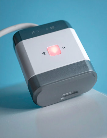 A compact smart home device is activated, its red indicator light glowing to signal an alert or active recording.