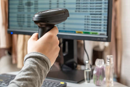 A warehouse woman employee accepts clothes using barcode scanner reading a bar code from price tag of female blouse and adds to the computer base.