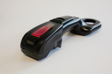Close-up of a human finger interacting with a sleek futuristic device emitting a red LED light. The image highlights the interface between human touch and modern technology, symbolizing innovation, biometric scanning, or digital access control in a minimalistic, high-tech environment.