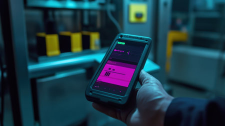 Supervisor holding smartphone and monitoring production process in high tech futuristic factory