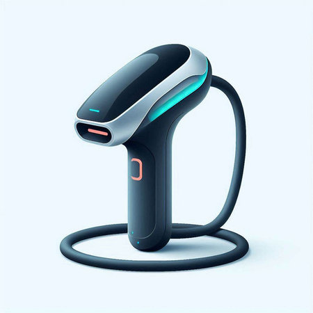 A modern handheld scanner projects a blue light while scanning a QR code against a dark background, emphasizing the integration of technology in retail and business environments.