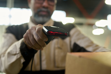 Close up of worker manages cargo barcode scanning in a distribution hub, preparing the goods with packaging, tagging and inventory checking. Man using a scanner in fulfillment center.