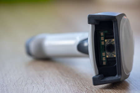 Timisoara, Romania - February 22, 2020: Close-up of a Datalogic handheld scanner on a wooden table