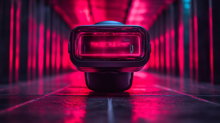 3D rendering of a virtual reality headset in a futuristic corridor with neon lights
