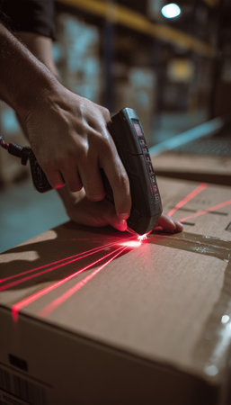 Detailed image of hands using a handheld barcode reader to scan a package in a warehouse. Red laser reflections are visible on the cardboard, highlighting the scanning process.