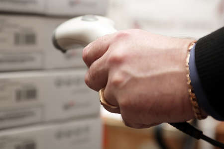 Focus on hand of warehouse manager scanning barcodes on packed cardboard boxes while checking information