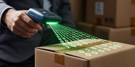 A person in a suit uses a dark blue scanner, its green laser beam projecting binary code onto a cardboard shipping box.