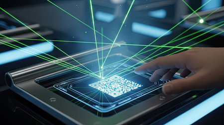 A hand interacts with a digital interface, activating a QR code projected on a screen. The image showcases bright green beams and geometric patterns overlaying a device. The composition emphasizes technology and innovation using cool colors and a modern style, suitable for various editorial and commercial applications.
