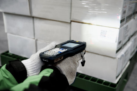 barcode scanner checking goods in cold room or warehouse. Selection focus shooting on LCD barcode scanner machine