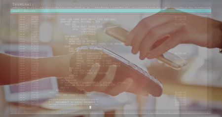 Image of lines and data processing over hands of caucasian woman using payment terminal. Data processing, communication and technology devices concept digitally generated image.