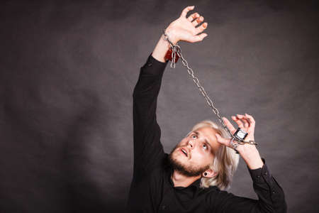 No freedom, social problems concept. Sad man with chained hands, studio shot on dark grunge background