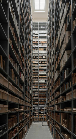 A long, narrow library aisle with tall shelves lined with books and boxes, viewed from the ground looking up.