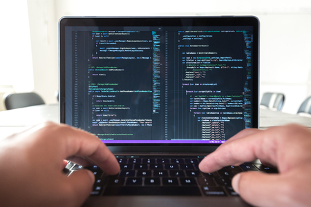 Software development. Software source code. Programming code. Writing code programming on laptop.