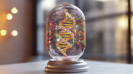 Stunning digital artwork showcasing a glowing DNA strand encased within a transparent capsule, emphasizing the advancements in genetics and biotechnology.