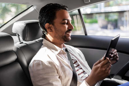 Interior of a luxury car with black leather finish, with a green screen on the dashboard. Man driving the car.