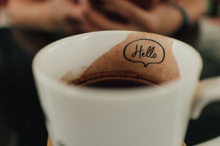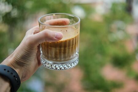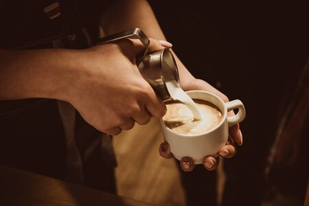 Eatting Hot coffee (espresso, cappuchino, latte) in ceramic white cup in hand with vintage tone, Copy space for your text.